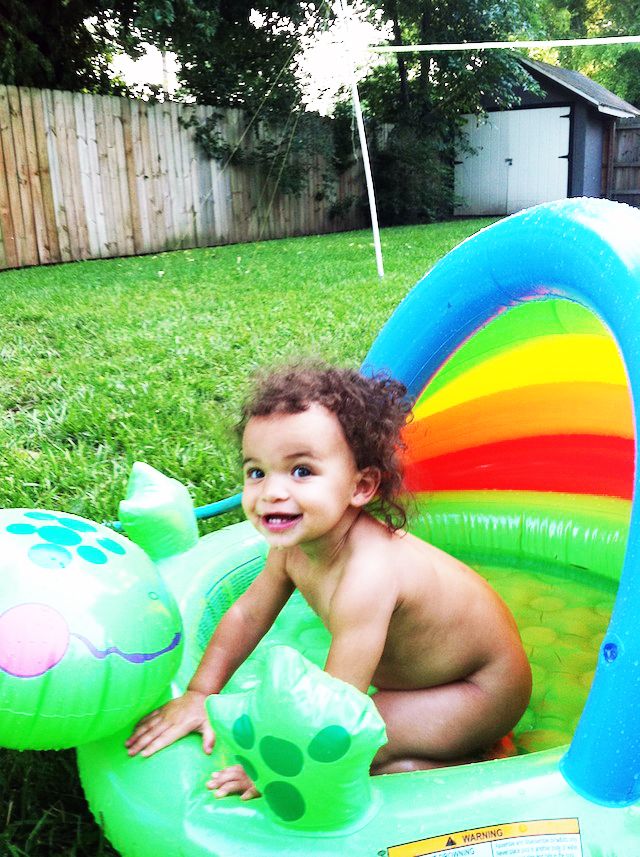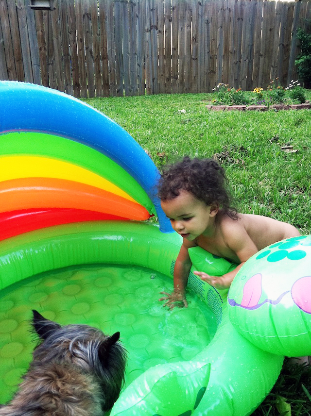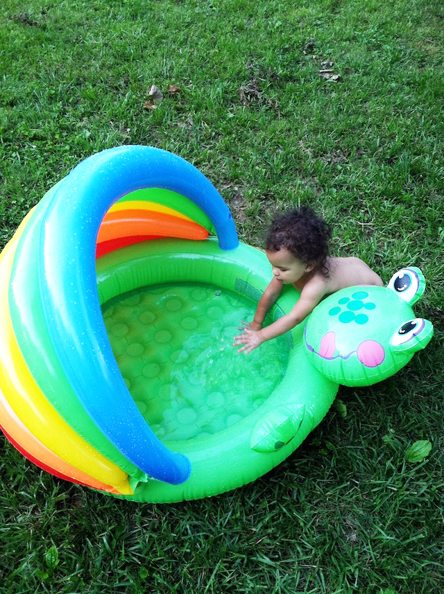 I used a bicycle pump to blow up Tessa's kiddie pool late this afternoon. We got it last summer but she was basically a tadpole then; we were way too premature with that particular purchase. A year goes by, though, and the timing is perfect. Of course, she sat on it the whole time I was blowing it up, getting more and more excited as the flattened frog became a puffy rainbow frog.