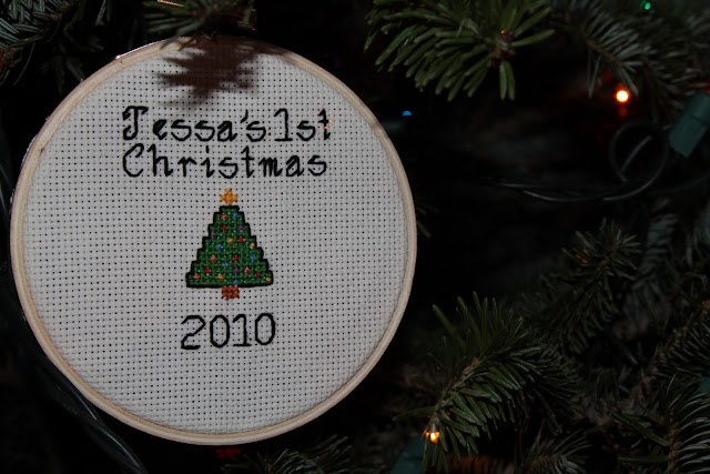 Last night, we watched Tootsie after we put Miss Bean to bed. I'd never seen it before, and holy moly I loved it. Now I realize what a rip-off Mrs. Doubtfire is, although I will always have love for Mrs. Doubtfire. (Robin Williams is actually my celebrity father of choice. As in, if I could pick any celeb to be my dad, it would be Robin. Who could be better?) While we were watching the movie, I cross stitched this little ornament for Tessa. I wanted something sort of hokey and handmade to remember her first Christmas by. Mission accomplished.