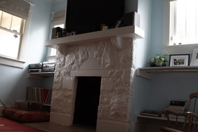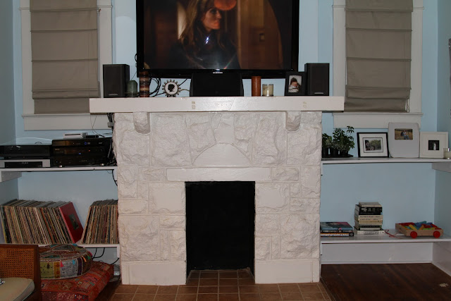 -- But most importantly, WE BUILT SHELVES! We’ve had our TV on this crappy Target brand entertainment center since we moved in four years ago. (I didn’t get a picture of it before we dismantled it, unfortunately.) But we decided to move the TV above the fireplace and build shelves on either side of it. It wasn’t easy, mostly because Nekos had to drill dozens of nails directly into a brick wall. But we feel really accomplished and love the way it turned out. Plus, our record collection is much more accessible now. I love that we can sit on the floor and rifle through them.