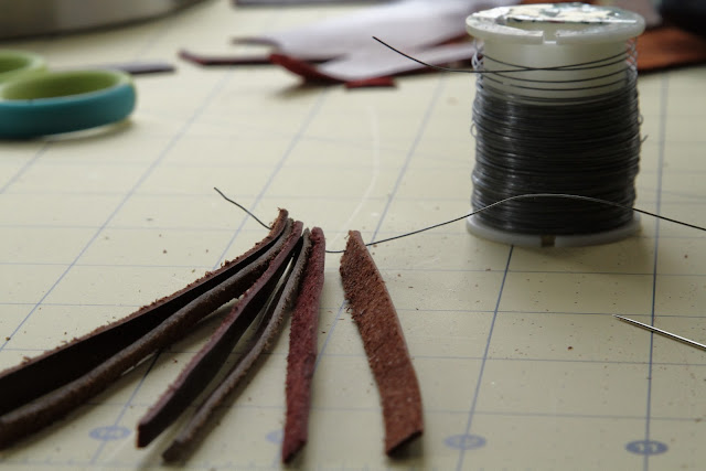 Cut your pieces of leather into thin strips. If you have leather thread, that would be even better! But I didn't so I created it. These don't have to be perfectly even.