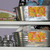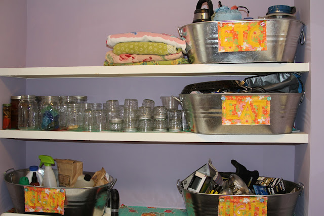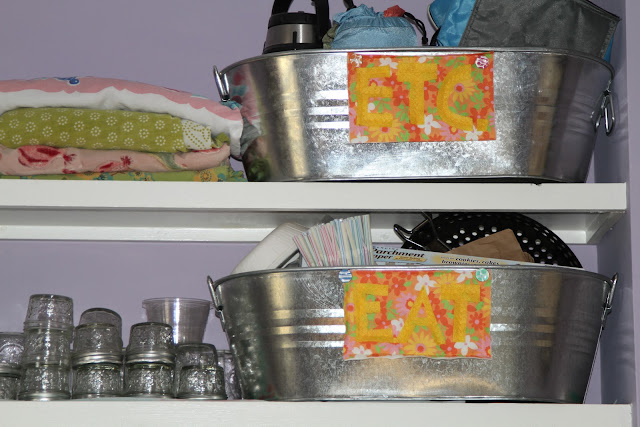 Then I bought these corrugated metal bins at Home Depot for $8 each. And I made these fun labels for them with some retro fabric I had. I did "Clean" for cleaning products, "Light" for light bulbs, "Eat" for paper plates, napkins, and other food-related items, and "Etc." for, well, other random things. I used magnets to attach the labels to the bins.