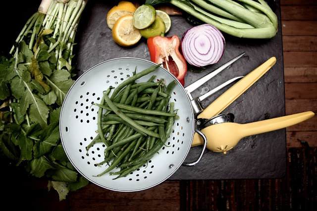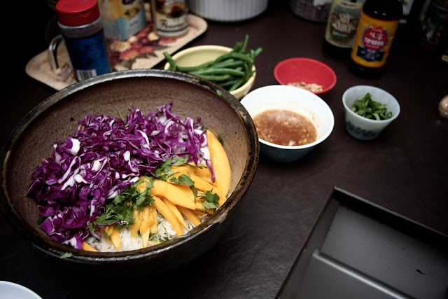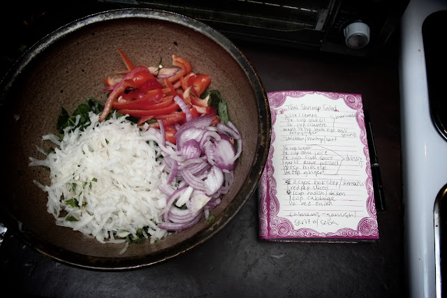 When my bestie, Molly Kincaid, told me she was thinking of starting a cooking blog, I was all over her to do it. I can't say enough good things about her cooking -- it's fresh, fun, and she does it with great joy. (When Nekos and I got engaged in 2005, Molly threw us a candlelit backyard engagement party and cooked up a Moroccan-themed feast that I'll never forget.) Add to that recipe her photographer boyfriend, Rocky Yosek, and you have the perfect cooking blog -- the recently launched pieforbreakfast.org. Together they live in Tucson, AZ, where she goes to law school and he works for the nonprofit Trees for Tucson. Please check out their website and add it to your blogroll; not only are the recipes inspiring but the photos are beautiful and colorful. I asked her to contribute a recipe to Black & White & Loved All Over and she cooked up this gorgeous Spicy Thai Shrimp Salad. Enjoy!