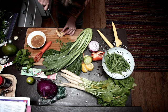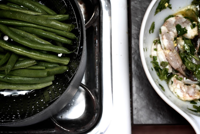 Combine all ingredients of the marinade over shrimp and refrigerate for an hour. Meanwhile make the dressing and start chopping. For dressing, whisk all ingredients in a bowl until sugar has dissolved. Chop all vegetables (except beans) and combine in a big bowl. Cook soba noodles.