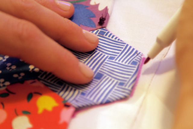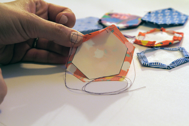 4) Hand fold the overlapping fabric over the hexagon and use a wide basting stitch to temporarily secure it into place.