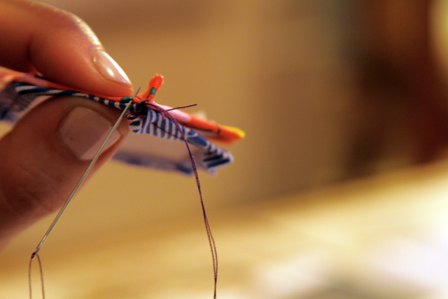 5) Once you've basted all of your hexagons, you'll start sewing them wrong side together using a whip stitch. Try not to catch any of the paper with your thread, just sewing the fabric together.