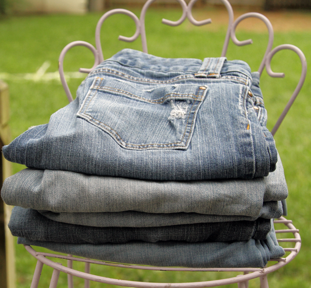 I've picked out five pairs of jeans -- well four pairs of jeans and one pair of jean shorts -- to restyle in completely different ways. I've had each of these pairs for at least five years so this here is a pile of memories:
