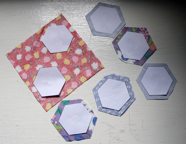3) Use a glue stick to glue a paper hexagon to the wrong side of your fabric. Then cut out each shape, leaving about a quarter of an inch seam allowance.