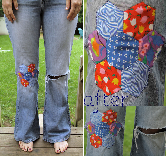 9) You will now be ready to attach your hexagon flower to your jeans or any other surface. Use a blind stitch to sew it onto your blue jeans. I actually sewed up the gap in my jeans by hand first and then sewed the patch on but I don't think that's necessary.