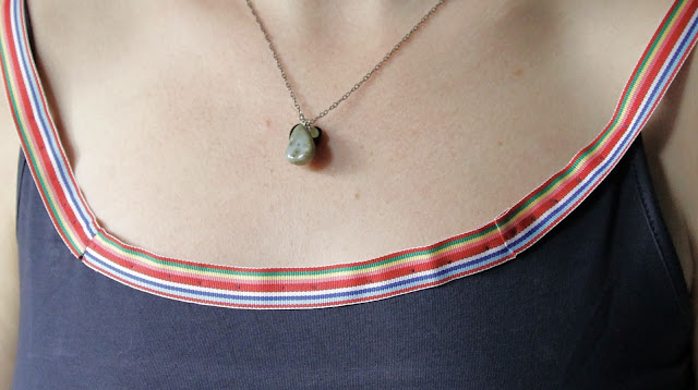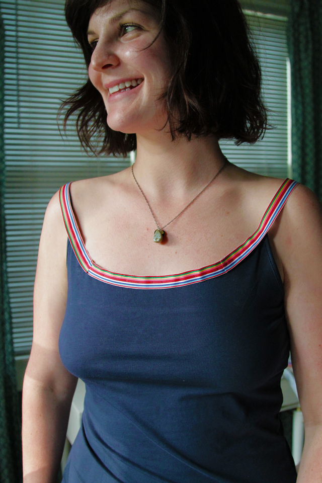 From here on out, I stitched everything by hand. After I tried on the tank and made sure the straps were adjusted the way I wanted them, I secured the ribbon to the strap every couple of inches with a stitch or two. It looked like this when I finished securing the ribbon to the straps.