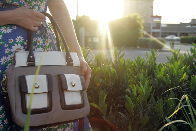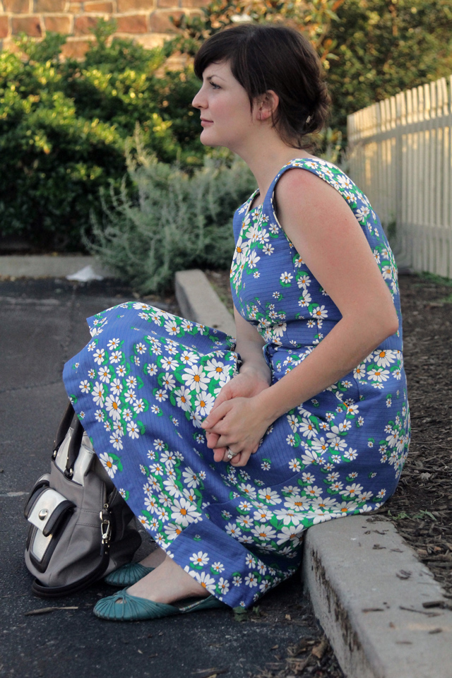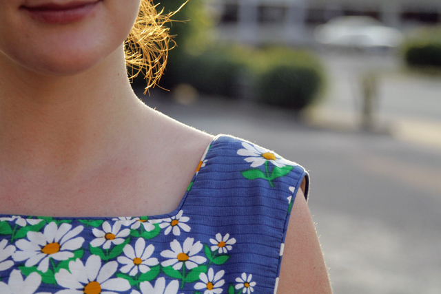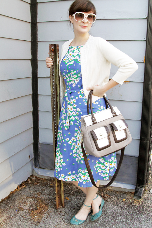 I got this vintage daisy-print wrap dress at the Nashville flea market yesterday and had to wear it out for date night last night. (While we were there, I also got the Dior sunglasses that I'm wearing sort of smugly in the last picture ... at least I really hope that they're Dior sunglasses; the guy gave me a strong sell about their authenticity.) I think I may alter this dress to either make it a few inches shorter or better yet just make it into a wrap skirt. Just because I felt a little too much like a church lady on Easter Sunday wearing this. But I still love, love the fabric and texture of this dress.