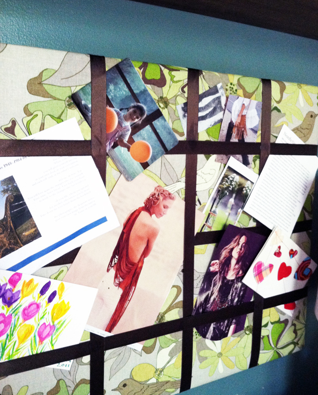 I made this bulletin board a couple of weeks ago with some fabric and ribbon, and it's since been hanging bare above my desk while I thought about how to use it. This morning I decided not to use it as a repository for bills or invitations or anything that's a drag at all. Instead this is to be the place for all the magazine clippings, poems, photos, and artwork that speak to me. It's my real-life Pinterest. I kind of love that it's above my desk, which is where a lot of dry writing has to get done on a daily basis. I hope it will remind me to keep dreaming, creating, and having fun. Also makes me think of a Picasso quote I saw on a painter friend's Facebook page today: “Art washes from the soul the dust of everyday life.” Nice one, Pablo.