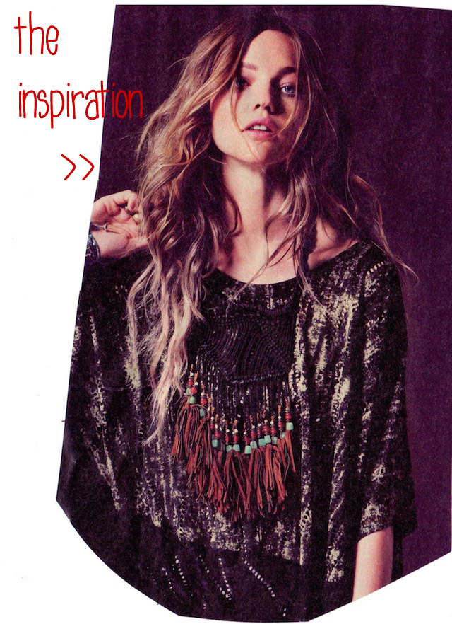 My inspiration for this necklace came from this clipping I pulled out of a Free People catalog a long time ago. I can't find the necklace online anywhere so here's my scanned picture. (Speaking of Free People, I am so stoked that I won this Free People dress today from my favorite fashion blogger Folake Huntoon!!! I never win anything. This is miraculous. Also, I'm not saying Folake is my favorite just because I won. See. She is legitimately my real-life style icon.)