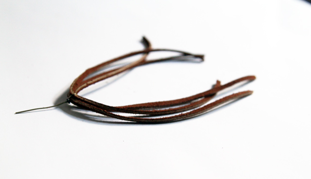 1) Cut 10" strips of leather lace. You'll need three of these strips to make one tassel. My necklace has seven tassels on it, so that means I cut twenty-one 10" pieces. To create a tassel, fold three pieces in half and wrap one end of your headpin around the fold, using your pliers to secure the headpin and clamp it to the leather.