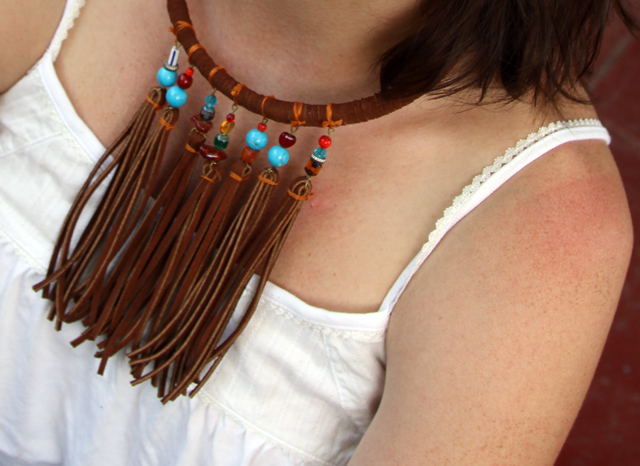 No. 1: Don't try to make your own leather lacing by cutting strips of leather freehand when you can just buy yards and yards of pre-cut leather lace for cheap at Michaels. No. 2: Don't leave your tassels just hanging in the wind, so to speak. I did that with that last necklace I made instead of drawing the strands of each tassel all together with a bit of embroidery floss. They look much more neat this way.