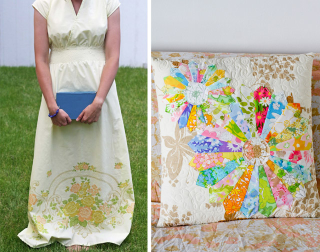 Vintage sheets are super neat, but dude I gotta draw the line somewhere when it comes to stuff like that. I'm not going to be laying my noggin down on just anyone's old drooled-on-and-God-knows-what-else bedding. I already get sketched out by hotel beds. I am, however, totally down with using old sheets to make forts, dresses, skirts, tablecloths, and most anything else. Please see how amazeballs this maxi dress is, for instance. And this pillow made from vintage sheet pieces: