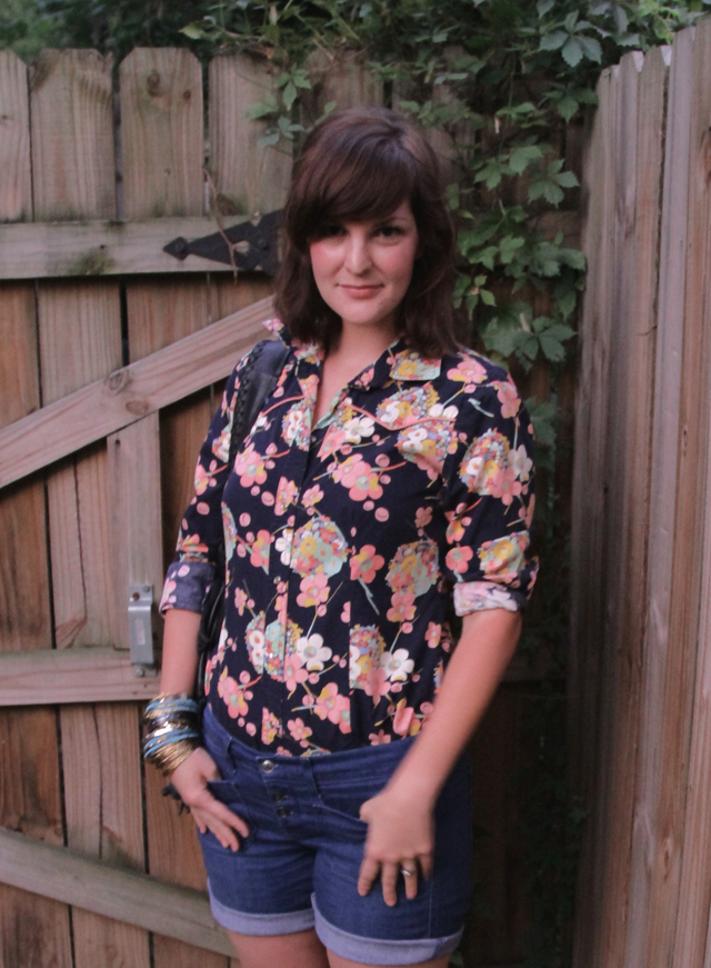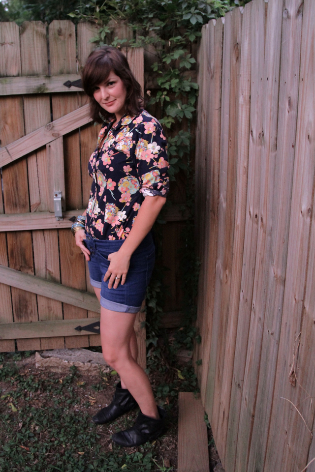 I apologize these outfit pictures are a little off because we were in a hurry and didn't have the ISO setting right. I don't even know what that means but that's what Nekos says so I'm sticking with it. Anyway, this outfit has defined my style for the past few weeks, which have been a leetle less scorching than previous months. A button-up tucked into jean shorts with boots. Also, I had a full-on arm party last night with about every bracelet I owned. So fun.