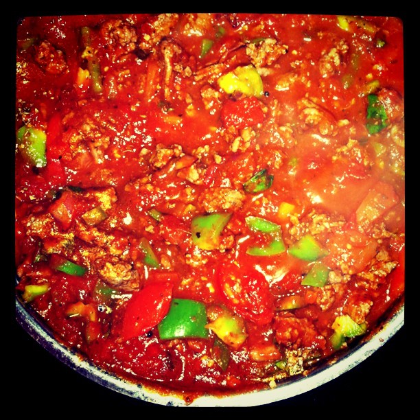A spin on it is to make three-way. Browned hamburger meat, tomato sauce, diced tomatoes, pinto beans, chili seasoning and spaghetti! Easy Peasy!