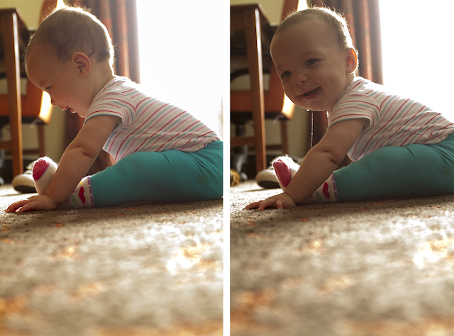 Oh My God: Livvy started sleeping through the night this last month. In the last 10 days she's only woken up once in the middle of the night. She generally sleeps from 7:30 p.m. to about 7 a.m. If she does wake up to eat, it's around 5 a.m. and then, belly full, she'll happily go back to sleep for another couple hours. Lastly, Livvy is a snuggle-holic. Girlfriend loves to kiss and hug and throw her arms around my neck and nestle her head under my chin when I'm carrying her around. She is a happy, easy baby, and she brings me so very much joy.